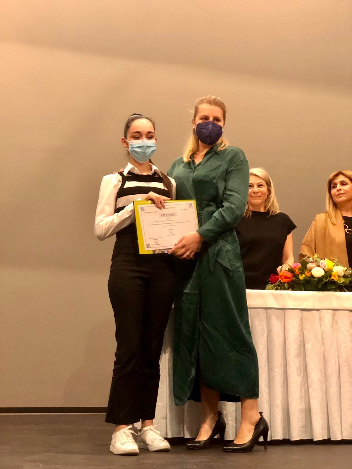 Την Τετάρτη 6 Απριλίου, στην Αίθουσα Εκδηλώσεων του 1ου Γενικού Λυκείου Ν. Ψυχικού, παρουσία της Υπουργού Παιδείας κ. Ν. Κεραμέως, ο Δήμος Φιλοθέης – Ψυχικού, βράβευσε τους σαράντα τρεις επιτυχόντες των Δημοσίων Λυκείων του δήμου, οι οποίοι στις Πανελλαδικές 2021 έλαβαν βαθμολογία άνω των 18000 μορίων. Μεταξύ αυτών συμπεριλαμβάνονται οι εξής τριάντα δύο απόφοιτοι  του σχολείου μας.