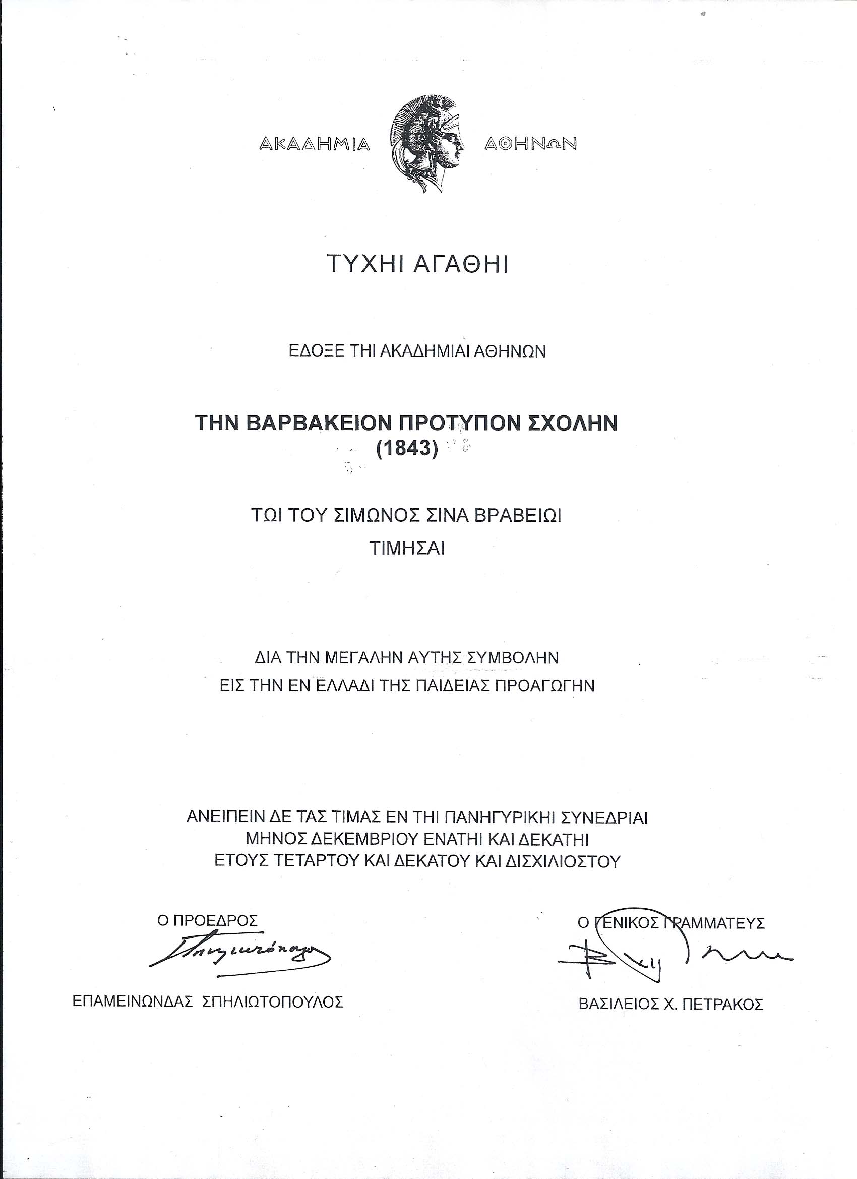 Απονέμεται το βραβείο Σίμωνος Σίνα στη Βαρβάκειο Πρότυπο Σχολή (1843), η οποία από τα μέσα του 19ου αι. χάρη στην ευεργεσία του Ιωάννη Βαρβάκη παρέχει υψηλής στάθμης διδασκαλία ως πρότυπος σχολή