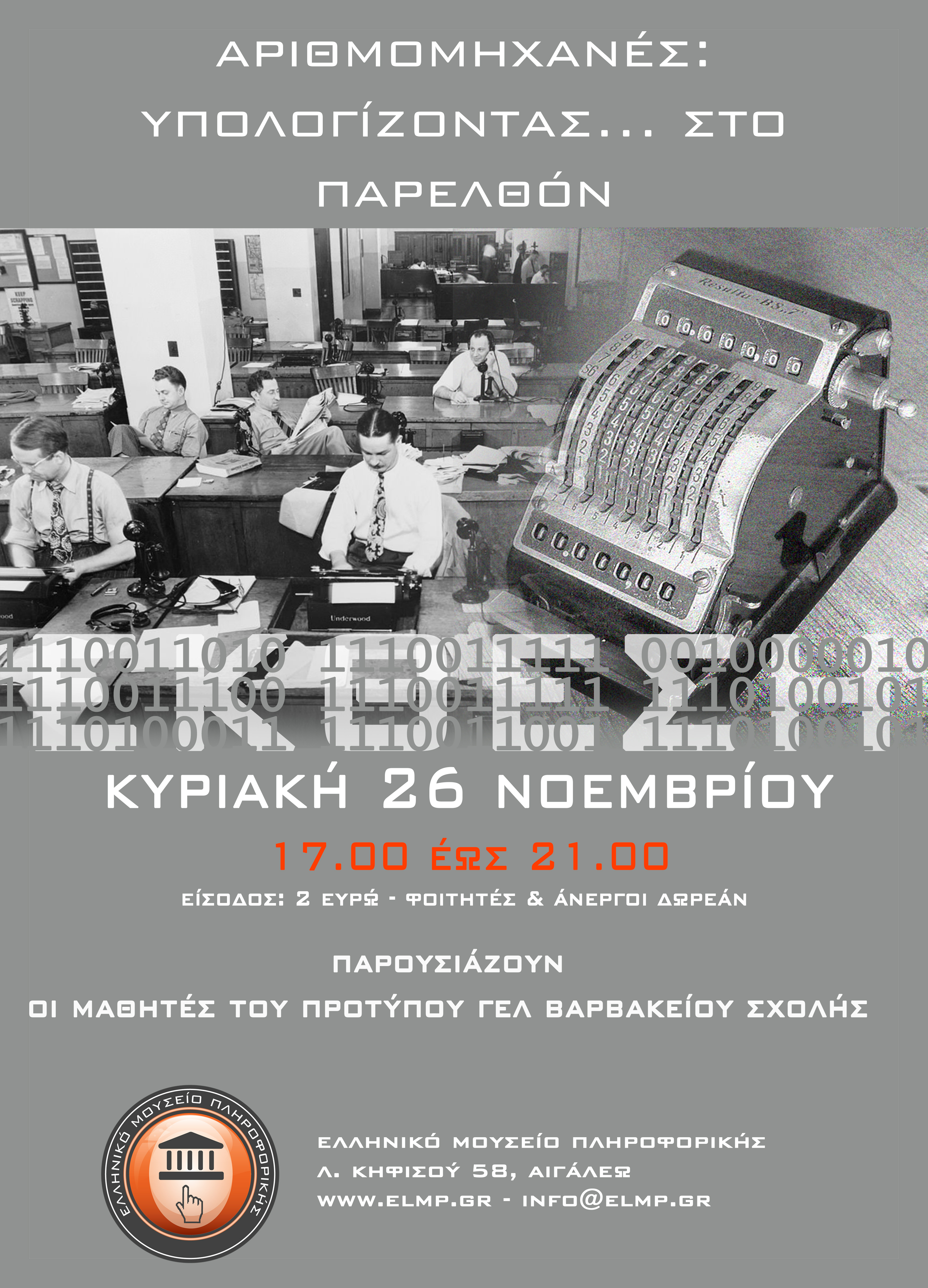 Tο Πρότυπο ΓΕΛ Βαρβακείου Σχολής σε συνεργασία με το Ελληνικό Μουσείο Πληροφορικής διοργάνωσε την Έκθεση Μηχανικών Αριθομηχανών την Κυριακή 26 Νοεμβρίουστον χώρο του Μουσείου. Οι συμμετέχοντες μαθητές παρουσίασαν μια αναδρομή στον χώρο των αριθμομηχανών και των ηλεκτρονικών υπολογιστών του παρελθόντος και έδωσαν στους επισκέπτες τη δυνατότητα όχι μόνο να παρατηρήσουν τον τρόπο λειτουργίας τους αλλά και να πειραματιστούν με μηχανικές και ηλεκτρονικές συσκευές του παρελθόντος.