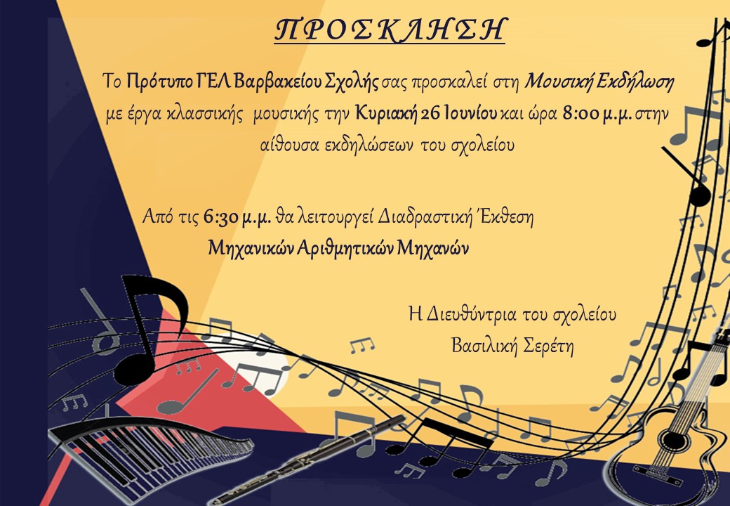 Διοργανώθηκε Μουσική Εκδήλωση με έργα κλασσικής μουσικής την Κυριακή 26 Ιουνίου και ώρα 8:00 μ.μ. στην αίθουσα εκδηλώσεων του σχολείου (πρόσκληση). Παρουσιαστηκαν γνωστά έργα των Beethoven, Bertini ,Chopin, Schubert, Schumann καθώς και άλλων σπουδαίων συνθετών. Συμμετέχουν με αλφαβητική σειρά οι μαθητές: